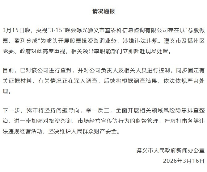 遵义市人民政府新闻办公室3月16日凌晨就荐股分成骗局发布情况通报。3月15日晚,央视“3·15”晚会曝光遵义市鑫犇科信息咨询有限公司存在以“荐股做票、盈利分成”为噱头开展股票投资咨询业务,涉嫌违法违规。遵义市及播州区党委、政府对此高度重视,相关领导率职能部门立即赶赴现场处置。目前,已对该公司进行查封,并对公司负责人及相关人员进行控制,同步固定有关证据材料,有关情况正在深入调查,后续将根据调查结果,依法依规严肃处理。下一步,我市将坚持问题导向,举一反三,全面开展相关领域风险隐患排查整治,进一步加强对投资咨询、市场经营宣传等行为的监督管理,严厉打击各类违法违规经营活动,坚决维护人民群众财产安全。