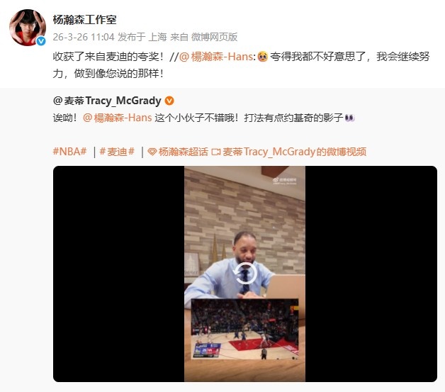 此前,NB名宿麦迪称“杨瀚森打法让他想到约基奇”,杨瀚森对此评论道:“🥹夸得我都不好意思了,我会继续努力,做到像您说的那样!”