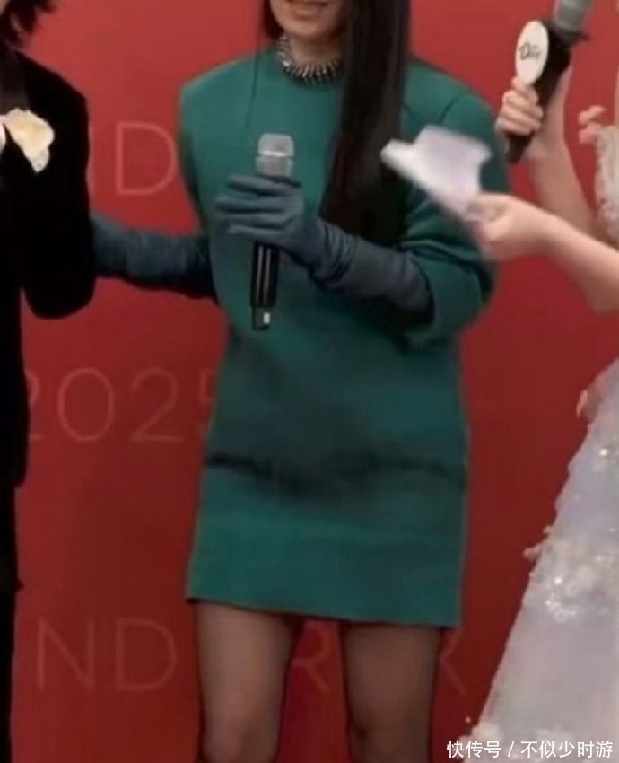 令人意外的是,年满58岁的那英身着一袭鲜亮翠绿短裙,搭配哑光质感黑丝与同色系过肘长手套,甫一现身便牢牢锁定全场焦点。